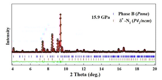 The XRD pattern of phase B was measured at 24.8 GPa and 15.9 GPa. In both patterns, peaks from solid N either in the or the phase could be identified, thus confirming the formation of solid N in the transformation. The remaining peaks in the pattern at 15.9 GPa were used for unit cell search using DICVOL06 [37]. Here again, two solutions were found compatible with the data; the first one is an orthorhombic unit cell of most probable space group Pnna with Å, Å, Å and volume 541.6(3) Å at 15.9 GPa; the second one is a monoclinic cell of most probable space group , Å, Å, Å, , and volume 296.95(1) Å. The Le Bail refinement using the Pnna cell is shown in Figure 5, and the one for the P2/m structure is given in Figure S14 of the SI. The orthorhombic cell better fits the data, and is thus the preferred solution. The volume ratio with respect to AA-II is 10.7, which suggests at least ten times more formula units. However, this large volume could also signal that phase B is not a single phase.