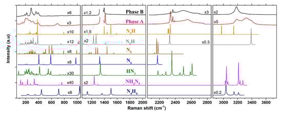 In order to establish the composition of the two newly formed phases A and B resulting from the transformation of AA at high P–T, we compared their Raman spectra and XRD patterns to those of poly-hydronitrogen NH compounds predicted as stable in the literature. We limited the comparison to compounds which have been predicted as stable below 60 GPa. Furthermore, we only present below results for compounds with a nitrogen/hydrogen content ratio equal or superior to AA. As a matter of fact, to the best of our knowledge, only two H-rich compounds besides ammonia have been reported so far to be stable in calculations below 60 GPa, of respective formula NH and NH [4]. Both contain H molecules and, as shown in Figure S10, have strong associated Raman peaks that are not observed in our experiments. The XRD the patterns were obtained from the optimized structure at 20 GPa, and the Raman spectra were computed using density-functional perturbation theory, as described in the Methods section. Figure 6 shows the comparison for the Raman spectra, and Figure S15 of the SI compares the XRD patterns.