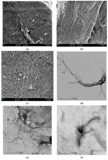 Morphological studies on CNF-PP1.0M, CNF-PP3.8M and CNF-PP5.6M were carried out using FESEM, TEM, and AFM, and the obtained results are shown in Figure 1. Table 2 displays the morphological characterisations, where the diameters of CNF-PP1.0M, CNF-PP3.8M and CNF-PP5.6M are recorded. Figure 1a–c shows the FESEM micrographs of CNF-PP1.0M, CNF-PP3.8M and CNF-PP5.6M, respectively, displaying their homogeneity and nanometric dimensions. The diameters of all three samples were computed by analysing the image using the processing software, Image J. The smallest and biggest diameters of CNF-PP1.0M, CNF-PP3.8M and CNF-PP5.6M were 49.93 and 167.6 nm, 25.46 and 34.67 nm, then 16.10 and 34.95 nm, respectively. Figure 1a–c shows the structure of the nanofibers after the acid hydrolysis and ball milling treatments. It can be seen that both treatments assist the separation of the bundle of fibers into individual fibers and fibrous network, thus leading to a significant reduction in their diameter size. The nanofibers of CNF-PP1.0M, CNF-PP3.8M and CNF-PP5.6M were visible in the freeze-dried samples. Nano-fragments may tend to agglomerate with nanofibers by an interfacial hydrogen bonding.
