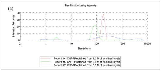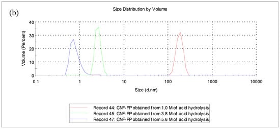 Particle size analysis (PSA) is a method used to obtain the particle size of CNFs in suspension that undergoes Brownian motion generated by thermally induced collisions between the CNF particles and solvent particles. The measured particle size, often called a hydrodynamic diameter, which indicates the way that the CNF particle diffuses within a fluid. It is essential to understand that PSA is based on the Stokes–Einstein equation, where the measurements refer to spherical particles and the orientation of the CNFs in suspension profoundly influences the particle size values obtained [44]. The size distribution of CNF-PP1.0M, CNF-PP3.8M and CNF-PP5.6M, as measured by particle size analysis, is shown in Figure 2a,b.