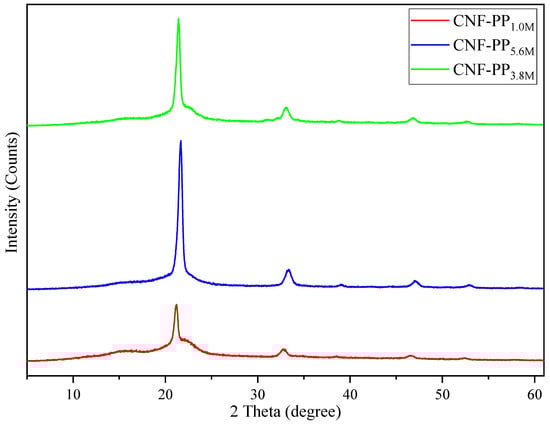 X-ray diffraction patterns of CNF-PP1.0M, CNF-PP3.8M and CNF-PP5.6M.