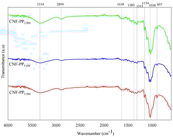 FTIR spectra of CNF-PP1.0M, CNF-PP3.8M and CNF-PP5.6M.