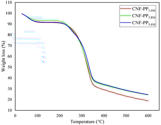 In the initial thermal degradation stage, the samples undergo weight loss due to dehydration [57]. These occurrences were observed between 30 and 100 °C, as displayed in Figure 5. On the other hand, samples with a lower molecular weight compound consisting of a hydroxyl group at the end of the chain might get evaporated at this stage, leading to further weight loss. Subsequently, the decomposition peak temperature presented in the DTG analysis illustrates a broad peak at 61.66, 58.07 and 62.50 °C for CNF-PP1.0M, CNF-PP3.8M and CNF-PP5.6M, respectively, demonstrating that the evaporation of adsorbed water occurs in all CNF samples. The weight loss observed for this stage of degradation for all three samples CNF-PP1.0M, CNF-PP3.8M and CNF-PP5.6M was 8.17, 6.24 and 7.99%, respectively. Compared to CNF-PP3.8M and CNF-PP5.6M, CNF-PP1.0M displays a higher weight loss at temperatures ranging from 30 to 100 °C. Based on these results, it can be deduced that CNF-PP1.0M possesses a higher moisture content than CNF-PP3.8M and CNF-PP5.6M.