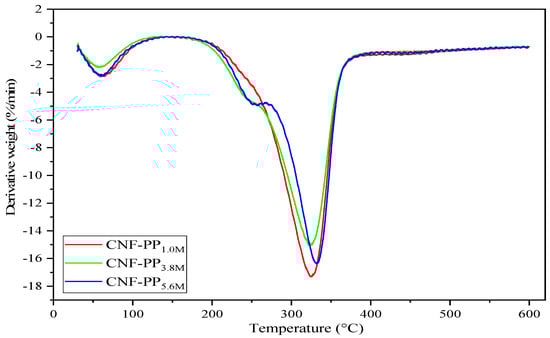 DTG curves of CNF-PP1.0M, CNF-PP3.8M and CNF-PP5.6M.