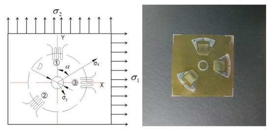 The substrate material used in this work was provided by Arcelor Mittal (Steelmaker, Uchino, France). The specimen was cut from a large plate and processed into a square plate with a thickness of 80 mm and a length of 200 mm. Table 1 shows the chemical compositions and supply state of the base material. The normalizing and tempering temperature of supplied substrate material were 910 °C and 720 °C, respectively. The cladding layer was 347L stainless steel strip with about 2 mm thickness. The specimen was welded by the electroslag strip cladding method with 10SW-Sandvik as a flux in Lanzhou LS Heavy Equipment CO., LTD (Lanzhou, Gansu, China). After preheating the base material, 4 passes cladding layer were welded on the surface in sequence, as shown in Figure 1. The welding current and arc voltage were 775 A and 30.0 V, respectively. Welding speed was controlled at 120 cm/min. After completing all welding processes, a blind hole method was applied to measure the WRS on the upper and lower surfaces of the welded piece in this paper. In principle, for a residually stressed body, the stress will be released at the locations of the hole even for a very small diameter. This is attributed to the zero shear and normal stresses on the principal axis perpendicular to a free surface. The redistribution of stress in the surrounding region will cause the local strains on the surface to change correspondingly. A BHI120-3CD-(11) strain gauge was chosen to be the gauge that measure the variation of the local strain, as shown in Figure 2. The strain gauge in three different directions can measure three different locations’ strain , and respectively, which relate to the maximum and the minimum principal stress in the drilled hole. The maximum and the minimum principal stress were calculated using the following Equations (1)–(3). Constants A and B in Equations (1)–(3) are stress relief factors related to the type of strain gauges, drilling parameters and measured material properties. The measurement principle diagram is shown in Figure 3.