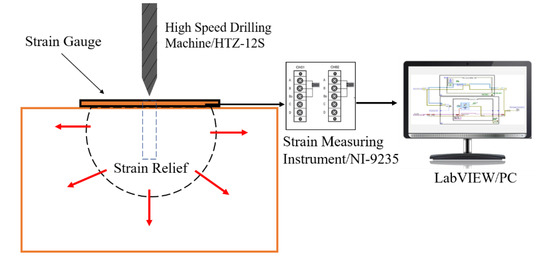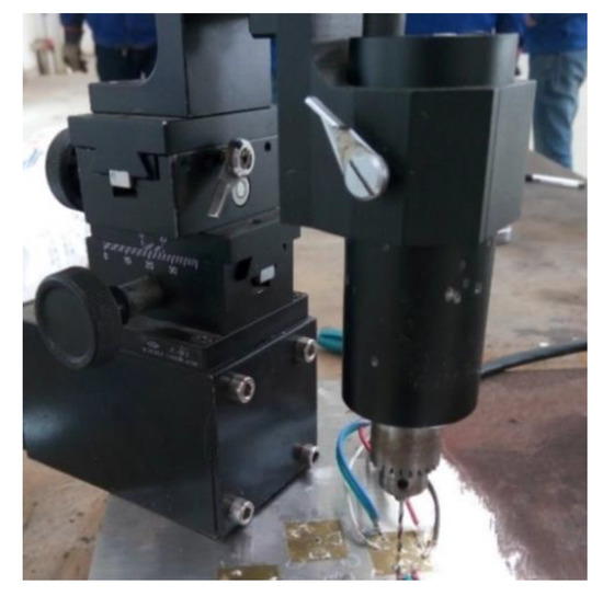 A blind hole method was implemented on the top and bottom surface of the welded specimen. The high-speed drilling machine HTZ–12S was chosen to be the drilling device, as shown in Figure 9. The main technical parameters of this device are as follows: aim-mid precision: ±0.001, hole depth control precision: ±0.05, maximum speed: 4000 r/min and bit clamping range: 0.3–4 mm. The resistance and sensitivity coefficient of strain gauge BHI 120-3CD (11) were 119.5–121.0 ± 0.5 Ω and 2.09% ± 1%, respectively. The depth and diameter of the blind hole were 2 mm and 1.5 mm, respectively. B-702 room temperature curing patch adhesive from AVIC Electrical Measuring Instruments Co. (Hanzhong, Shaanxi, China). was selected for sticking strain gauges. The characteristics of this patch adhesive are strong adhesion, low creep and hysteresis, poor temperature and humidity resistance. It is suitable for the adhesive of room temperature strain and stress test with short cycle. The strain measurement instrument was NI-9235 from National Instruments Co., Ltd (Austin, TX, USA). It is characterized by high accuracy (0.1%), high cost performance, flexibility and ease of use.