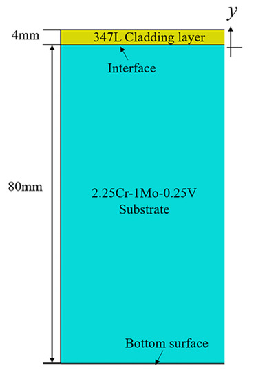 As mentioned above, the substrate of the system was a 2.25Cr–1Mo–0.25V steel with thickness of 80 mm. The thickness of cladding welded in a single layer is typically 4–4.5 mm thick in practice. Without loss of generality, 347 L austenitic stainless steel with 4 mm (hCL) cladding thickness was selected; the geometric FEM dimensions are shown in Figure 4. The cladding/substrate system consisted of 2.25Cr–1Mo–0.25V steel with 80 mm (hSub) thickness as the substrate and 347 L steel as 4 mm thick cladding.