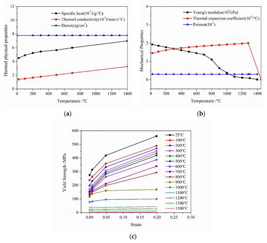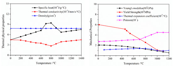 In the thermal analysis step, temperature evolution in the cladding/substrate system was calculated in detail, especially for the cooling process which WRS was mainly generated. The temperature dependencies of the thermal physical and mechanical parameters of 2.25Cr–1Mo–0.25V substrate and 347 L cladding are shown in Figure 5 and Figure 6 [22], respectively. Figure 6 shows that the tensile stress of 347 L steel at temperature levels from 25 to 1500 °C was expressed and captures the strain change in the cladding layer to a great extent. To obtain the precise temperature distribution, the effects of convective heat transfer and heat radiation were considered both at the bottom and the top surfaces. The values for convective heat-transfer and heat-emissivity coefficients were 10 W·m−2·K−1 and 0.7, respectively [21]. The preheat temperature of the substrate was assumed to initially be 200 °C, and the effects of preheat temperature are discussed later in this paper.