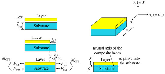 In this analytical solution, only the elastic strain is considered; WRS distribution through substrate thickness was linear. Therefore, only WRS at the top and bottom of the substrate had to be calculated, as follows: