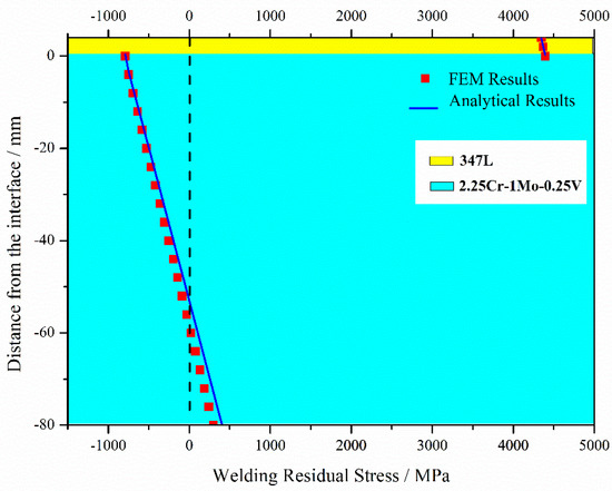 Diverse FEMs have been proposed to simulate the WRS in the last few decades, including two and three-dimension, single and multi-pass FEM. However, these FEMs have rarely been compared to analytical models. In this study, prior to elastic–plastic analysis, the elastic analysis model was first established and compared to the analytical model for verification. Unlike the elastic–plastic model, the yield stresses of 2.25Cr–1Mo–0.25V and 347L steel type were not applied in the elastic model. Other parameters in Figure 5 and Figure 6 were not changed.