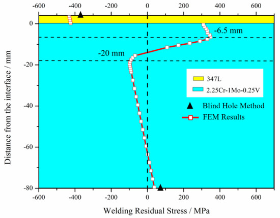 The plasticity of the 347L and 2.25Cr–1Mo–0.25V steel types was assigned to the model on the basis of the elastic model, temperature-dependent plasticity is shown in Figure 5 and Figure 6. The final WRS distribution of the elastic–plastic model and comparison with the experimental results are shown in Figure 10. It can be seen that the experimental value on the top surface of the cladding layer is −377.58 MPa (The negative indicates that the WRS is compressive), which is smaller than the absolute value of the FEM value −432.93 MPa. The relative error between the FEM value and the experimental value is 14.66%. WRS on the bottom of the substrate is 75.98 MPa tensile stress. This result is obviously larger than the FEM result (39.08 MPa). The error of the FEM value relative to the experimental value reaches 48.57%. The reason why the bottom surface has such a large error may be that the deformation of the 4 passes cladding layer in the experiment is greater than that of the simplified single pass cladding layer in the FEM. In summary, for residual stress measurement, the results of the FEM were in good agreement with the experimental values. Therefore, the experimental results verified directly the accuracy of the elastic-plastic model.