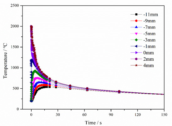 Temperature histories of elements in cooling (values from −11 to 4mm represent the element distance from the interface, and elements at cladding layer expressed as positive; cladding layer (4, 2 and 0 mm), SA L(−1, −3, −5, −7, and −9 mm) and substrate (−11 mm)).