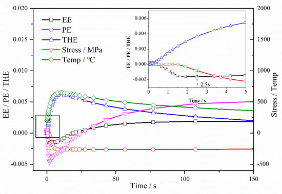 WRS evolution in these three parts is discussed in detail. The element at 1.75 mm in the cladding layer was selected as representative for the entire cladding layer. Figure 11 shows the first half of the cooling process of the element at 1.75 mm. According to the behavior of plastic strain, the cooling process of the cladding layer could be divided into three stages: (i) 0–2.5 s, where 347L steel becomes tensile yielding at 2.5 s; (ii) 2.5–154 s, where plastic strain reaches a maximum at 154 s; and (iii) 154–4000 s, where plastic strain maintains its maximal value.