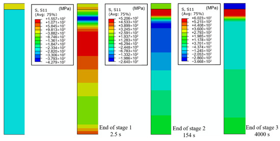 In the third stage with uniform cooling, there was a gradual effect of the plastic strain that was generated in the two former stages. The elongated plastic strain of the cladding layer led to compressive WRS. By contrast, the constringent plastic strain of the SAL led to tensile WRS, as shown in Figure 10.