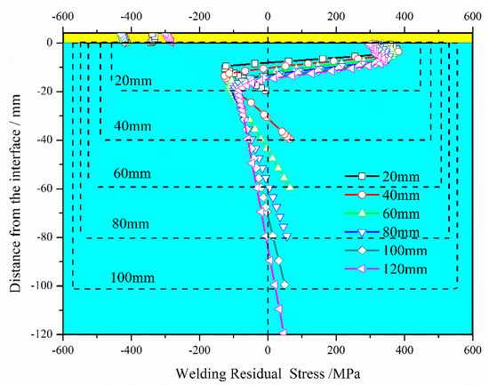 Moreover, from Figure 10, the following observations were made: (i) WRS distribution could be divided into three parts―cladding layer (0 mm–4 mm, from welding interface to top surface of the cladding layer), SAL (–20 mm–0 mm, from the top part of the substrate adjacent to welding interface), and substrate (from –80 mm to –20 mm); (ii) stress in the cladding layer was compressive [10]; (iii) stress in the SAL was partly tensile and partly compressive; and (iv) stress in the substrate was partly tensile and partly compressive.