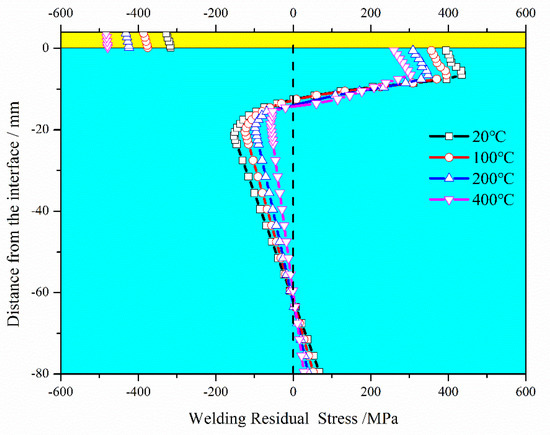 Preheat temperature significantly affected welding quality and service performance, and especially weldability, WRS, and weldment toughness. Figure 17 shows the effect of different preheat temperature levels (20 °C, 100 °C, 200 °C and 400 °C) in terms of final WRS state. The following observations were made: (i) by improving preheat temperature, the thermal mismatch stress between the cladding layer and substrate decreased, leading to a decrease in the substrate WRS. (ii) In the SAL, the final WRS decreased as the preheat temperature was increased to 400 °C. SAL thickness decreased from 21.5 mm without preheat to 18.5 mm with 400 °C preheat. (iii) Compressive WRS in the cladding layer, on the other hand, increased with the increase in preheat temperature.