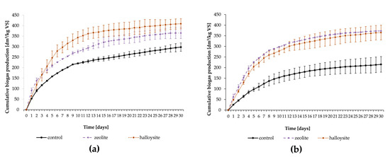 In the variant with maize silage as substrate, the addition of halloysite resulted in a higher reduction of VS than the addition of zeolite, and this also corresponded to the results for biogas production and COD reduction. Biogas production increased by up to 37% (halloysite) and 22% (zeolite), and COD was reduced by up to 41% and 32%, respectively. In the variant with sewage sludge, the results for VS reduction also corresponded with the results for biogas production. Biogas production and VS reduction during the anaerobic digestion of sewage sludge for both minerals were statistically similar, biogas yield increased by up to 70% (halloysite) and 73% (zeolite). VS reduction was also significant—that is, 48% (halloysite) and 51% (zeolite)—compared with the control (45%).