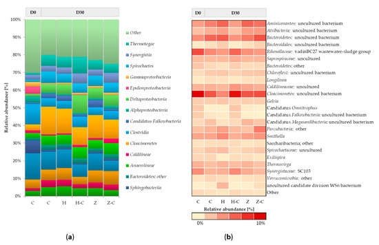 Figure 2 shows the taxonomic composition of bacterial communities in batch anaerobic digestion processes with or without minerals (halloysite or zeolite). At the beginning of the anaerobic digestion process, the bacterial community mainly consists of classes Bacteroidia, Clostridia, Sphingobacteriia, Bacteroidetes, and Epsilonproteobacteria. After 30 days of anaerobic digestion, changes in the abundance of the dominant classes of bacteria were noticed, and the following classes were recognized in the control (without minerals): Cloacimonetes, Bacteroidia, Spirochaetes, Bacteroidetes, Thermotogae, Aminicenantes, Anaerolineae, Clostridia, and Deltaproteobacteria. No significant differences in bacterial community structure between the control culture and the anaerobic digestion variants with halloysite and zeolite were observed. Only the minor increase of the relative abundance was observed in the classes of Deltaproteobacteria (Figure 2a). This result suggested that the addition of mineral sorbents did not disturb the structure of the bacterial community during the anaerobic digestion process.