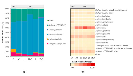 Relative abundance of archaeal OTUs: (a) archaeal classes and (b) archaeal genera with an abundance > 1% in at least one variant are shown. C: control; H: halloysite; H-C: halloysite-colonisation; Z: zeolite; Z-C: zeolite-colonisation; D0: Day 0; D30: Day 30.