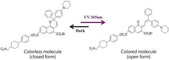The cholesteric liquid crystal (CLC) mixture was made from 96 wt.% negative dielectric anisotropy nematic liquid crystal DNM-9528 (extraordinary index ne ≈ 1.5792, ordinary index no ≈ 1.4808, dielectric anisotropy Δε = ε// – ε⊥ ≈ –4.8, rotational viscosity coefficient γ1 = 96 mPa∙s, splay elastic constant K11 = 12.4 pN and bend elastic constant K33 = 12.8 pN), doped with 4 wt.% chiral agent R-5011 (HTP ≈ 100 μm−1, from HCCH, Jiangsu, China), whose chemical structure is presented in Figure 1; the pitch of the CLC was approximately 250 nm. Then, 97.65 wt.% CLC mixture was further homogeneously blended with 0.35 wt.% tetrabutylammonium tetrafluoroborate ((CH3CH2CH2CH2)4N(BF4)) salt (TBATFB, from Sigma Aldrich, St. Louis, MO, United States), and 2 wt.% photochromic dichroic dye molecule ethyl 8-((4’-pentylcyclohexylphenyl)-difluoromethylphenyl-4-yl)-2-phenyl-2-(4-pyrrolidinyl phenyl)-2H-naphtho[1,2-b]pyran-5-carboxylate (from ITRI, Hsinchu, Taiwan), the chemical structure presented in Figure 2. All of the mixture was sandwiched between two glass substrates without any alignment treatment; the inner surfaces of both substrates were pre-coated with indium tin oxide to cause them to function as transparent conductive layers. The cell gap was approximately 12 μm.