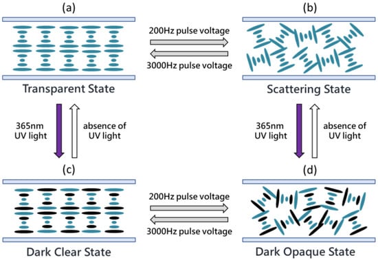 Figure 8 presents photographs of the proposed smart window. Each state existed stably without the application of a field. Figure 8a,b show the transparent state and scattering state without exposure to UV light. The transparent state is colorless and allows the background to be seen clearly. The scattering state is white and blocks the background. Figure 8c,d present the dark clear state and the dark opaque state under irradiation by UV light. In the dark clear state, since the absorption peak of the photochromic dye is around 560 nm, the sample has deep purple discoloration. The dark opaque state exhibits absorption and scattering, and so has the lowest transmittance and provides the best shielding. Figure 9 shows microscopic images of each optical states.