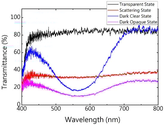 The degree of absorption of visible light by photochromic dichroic dye can be controlled by exposure to, or the absence of, UV light. Scattering can be controlled by applying voltage pulses of different frequencies. Therefore, this smart window could adopt four optical states—transparent, scattering, dark clear, and dark opaque; each state was stable at 0 V. Figure 4 shows the transmission spectra in these four states, which are compared in Table 1 with respect to average transmittance and haze. The transmittance in the transparent state was high in visible region and almost no scattering occurred; the average transmittance exceeded 83%, and the haze was less than 6%; in the scattering state, the haze was uniform; the average transmittance was only 32.2% and the haze as high as 70.4%. When the dye was irradiated for 1 min with UV light with a wavelength of 365 nm and an intensity of 10 mw/cm2, the dye photochromic dichroic transitioned from closed form to open form and absorbed. Since the absorption peak of the photochromic dye is around 560 nm, the transparent state had deep purple discoloration. The average transmittance of the dark clear state was 30.3%, and the haze was 8.3%, slightly higher than in the transparent state; in the dark clear state, the average transmittance was lowest at 14.2%, and the haze was highest at 74.9%.