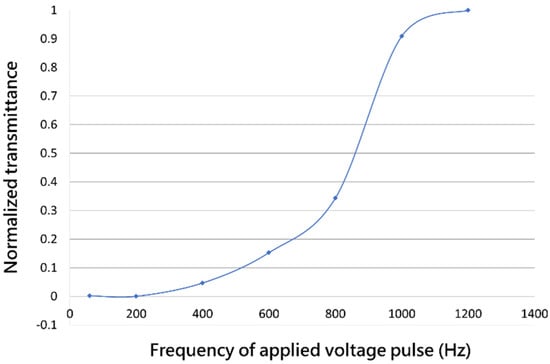 Transmittance versus frequency of voltage pulse is shown in the Figure 5. The CLC was initially in the planar state with high transmittance, then a 60 V voltage pulse with different frequency was applied to measure the transmittance. When a low-frequency voltage was applied across the cell, the motion of the ions created turbulence and tended to align the liquid crystal along the direction of movement. This turbulence effect distorted the helical structure and turned the CLC from the focal conic state to the planar state, where we chose 200 Hz as the low-frequency voltage pulse. When the frequency increased, the turbulence became weak and the dielectric effect of LC dominated the alignment. Therefore, it maintained in the planar state with high transmittance. Here we chose 3000 Hz as the high-frequency voltage pulse.