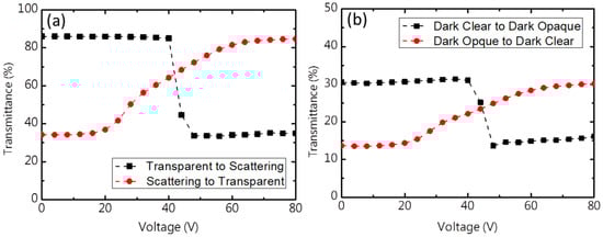 The electro-optical characteristic of the smart window was measured before and after irradiation by UV light; a voltage pulse with a duration time of 3 s was applied and the transmission was measured 10 s after the end of the pulse. Hence, all transmissions were measured at 0 V. Figure 6 plots the transmittance of the smart window after the removal of the applied voltage vs. the amplitude of the applied voltage pulse. A parallel tungsten halogen was the light source and a spectrometer was used as the detector. Figure 6a plots the T–V curve of the smart window in the absence of UV light. The transparent state switched into the scattering state as shown in Figure 6a (black line). Voltage pulses with a frequency of 200 Hz switched the liquid crystal from the transparent planar state to the scattering focal conic state. When the voltage pulse was below 40 V, the turbulence that was generated by the ions was not enough to cause a transition of the liquid crystal; when a voltage pulse over 40 V was applied, the turbulence effect was against the dielectric interaction because of the negative dielectric anisotropy of the liquid crystal; the helical structure in the planar state was disturbed, and ultimately switched to the focal conic state. As the voltage was increased, the turbulence effect became stronger, and the focal conic domain size became smaller, close to the wavelength of visible light. Therefore, more scattering reduced transmittance. When a voltage pulse of 50 V was applied, the transmittance was at its minimum, and the ionic turbulence was greater than the dielectric interaction. The scattering then switched into the transparent state as shown in Figure 6a (red line). Voltage pulses with a frequency of 3000 Hz switched the liquid crystal from the focal conic into the planar state. Pulses of 50 V and a frequency of 200 Hz were applied to reset the sample into the focal conic state before applied measurement voltage pulses. A voltage pulse with a duration time of 3 s was applied and the transmission was measured 10 s after the end of the pulse. Voltage pulses with a frequency of 3000 Hz yielded very weak ionic turbulence because the high-frequency voltage limited their mobility, so only negative dielectric anisotropy contributed to all of the electrical properties. When the voltage pulse was less than 20 V, the liquid crystal molecules were not arranged in parallel as the substrate, and the focal conic state was maintained. As the applied voltage pulse increased, some regions adopted the parallel substrate alignment due to the negative dielectric anisotropy of liquid crystal molecules and the formation of a planar structure as a result of the helical twisting power that arose from the chiral doping. When the voltage pulse exceeded 70 V, all liquid crystals were arranged in a planar state as a result of the electric field, and this state was stably maintained after the voltage was turned off.