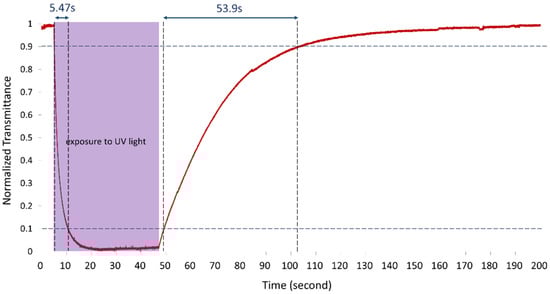 Figure 7 plots the time-dependence of the optical response to exposure UV light. The smart window in the planar state was irradiated by UV light with a wavelength of 365 nm and an intensity of 10 mw/cm2 for 42 s, and thus changed from colorless to deep purple. The response time for the normalized transmittance to decline from 90% to 10% was 5.5 s. The UV light was then turned off and the light transmittance of the smart window returned to high. The response time for the normalized transmittance to increase from 10% to 90% was 53.9 s.