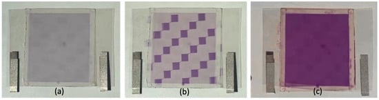Figure 10 shows photographs of this smart window irradiated by real sunlight at noon at National Sun Yat-sen University. Before it is exposed to sunlight, the sample is in the transparent planar state and colorless, as displayed in Figure 10a. Figure 10b shows this smart window covered by a checkerboard mask and exposed to sunlight for five minutes. The part that was irradiated by sunlight entered the dark clear state. Finally, the mask was removed and the sample was exposed to sunlight for five minutes; a uniform dark clear state was obtained across the entire surface, as shown in Figure 10c.