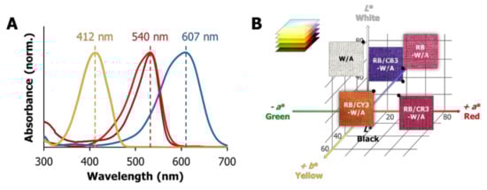 To broaden the colorimetric range of the RB-loaded W/A blended fabrics, here we introduced three representative cationic dyes onto the acrylic fibers: cationic yellow (CY), blue (CB) and red (CR). As shown in Figure 1A, the maroon, yellow, blue and red curves represent the normalized UV-visible spectra of RB, CY, CB and CR dyes in deionized water, respectively. In comparison with the absorption peak of RB (~400–580 nm, λmax = 540 nm), that of CY (~320–470 nm) was centered at 412 nm and exhibited a minor overlap with RB, whereas the absorption of CB was centered at 607 nm and also showed a partial overlap with RB. Not surprisingly, however, CR (~400–590 nm) exhibited a nearly identical absorption profile as that of RB while sharing the same maximum absorption wavelength at 540 nm. Thus, it was expected from these solution studies that the addition of cationic dyes would influence the colorimetric characterization of RB-W/A fabric, as well as potentially their photooxidation and/or photodynamic efficacies.