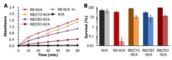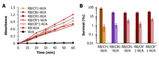 (A) The absorbance of I3− (352 nm) in the 0.5 M KI solution that underwent photooxidation by RB/CY1-W/A (orange), RB/CB1-W/A (purple), RB/CR1-W/A, RB/CR′1-W/A and RB/CR″1-W/A (maroon), in comparison with a PS-free light control (black) as a function of illumination time (0–60 min). (B) Photodynamic antibacterial studies against S. aureus using RB/CY1-W/A, RB/CB1-W/A, RB/CR1-W/A, RB/CR′1-W/A and RB/CR″1-W/A. Displayed is the % survival for each sample in the dark (dark bar) and light (light bar) conditions. The light conditions were as in Figure 2.