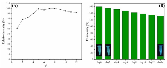 (A) Effect of pH on the fluorescence intensity of L-CDs; (B) the fluorescence intensities of the synthesized CDs at different storage times.