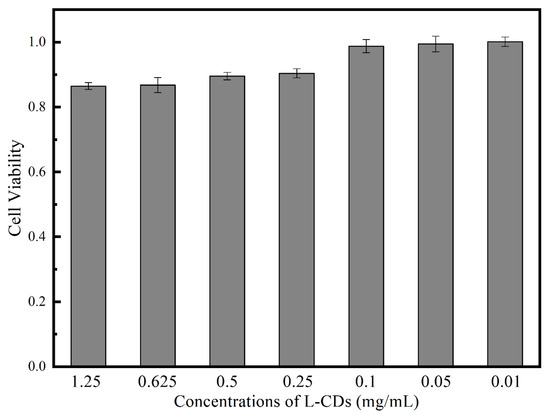 Cell viability values (%) estimated by WST-1 assay versus incubation concentrations of L-CDs (0, 0.05, 0.1, 0.25, 0.5, 0.625, and 1.25 mg/mL) at 37 °C for 24 h.
