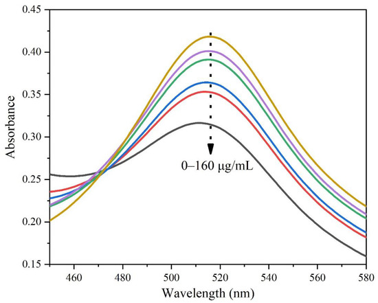 DPPH was used to investigate the radical scavenging activity of L-CDs in solution. DPPH is a very stable free radical with a nitrogen center. After receiving a hydrogen radical, DPPH could form the steady DPPH2 complex, bringing the decrease of the absorption peak at 520 nm [36]. The scavenging activity of L-CDs towards DPPH at the concentration from 0 to 160 μg/mL was investigated. As demonstrated in Figure 5, as the concentration of L-CDs continues to increase, the absorbance of DPPH at 520 nm gradually decreases. Ultimately, the ratio of the radical scavenging activity of L-CDs towards DPPH was calculated to be about 31.5%. The calculation method follows this formula: Inhibition (%) = (the absorbance of Acontrol—the absorbance of Asample/the absorbance of Acontrol) × 100%, where Asample and Acontrol refer to the absorbance of the DPPH at 520 nm with and without L-CDs, respectively.