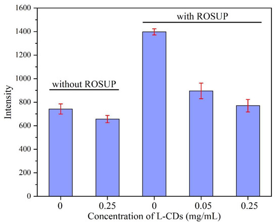 Reactive Oxygen Species Assay Kit was used to investigate the intracellular radical scavenging activity of L-CDs. DCFH-DA is a cell-permeable probe for detecting the intracellular ROS. DCFH-DA has no fluorescence itself with an ability to cross the cell membrane freely. After entering the cell, DCFH-DA is hydrolyzed to DCFH by the cellulase, and then intracellular ROS can oxidize non-fluorescent DCFH to fluorescent DCF. Then, the intracellular ROS level can be determined by measuring the fluorescence intensity of DCF. In this experiment, we detected the scavenging effect of L-CDs on ROS of cells themselves, and examined the ability of L-CDs to remove the intracellular elevated ROS produced by ROSUP treatment (ROSUP is a positive contrast agent that can produce extra ROS in cells). As shown in Figure 6, without ROSUP, the fluorescence intensity of cells decreased slightly after adding L-CDs, which indicated that the ROS level in normal cells was not high and could be effectively removed by L-CDs. Meanwhile, with ROSUP, the level of intracellular ROS increased significantly, as a result of the introduction of external ROS. When the L-CDs were added, the fluorescence intensity of the cells decreased sharply; even 0.05 mg/mL of L-CDs can reduce the fluorescence intensity by about 30%, and 0.25 mg/mL of L-CDs can further reduce the fluorescence intensity, making it almost no different from the normal cell. The results prove that a low concentration of L-CDs solution can significantly remove extra ROS in cells. Thus, the L-CDs have great application prospects in cell antioxidant.