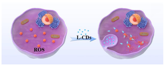 Carbon dots (CDs), as a kind of quasi-zero-dimensional carbon nanomaterial, have been widely studied by scientific researchers thanks to their unique advantages, and have broad application prospects in the fields of medical diagnosis, bioprobes, bioimaging, and tumor treatment [1,2,3,4]. CDs have also been reported to be used in the detection and elimination of reactive oxygen species (ROS), as a result of the special effect of ROS on organisms [5,6,7,8,9,10]. As we know, ROS is a class of single electron reduction product of oxygen in vivo [11]. The most common ROS species include singlet oxygen (O2), hydrogen peroxide (H2O2), hydroxyl radical (-OH), superoxide (O2−), nitric oxide (NO), and peroxynitrite (ONOO−), among others. Once ROS are produced, because of their high reactivity, they may cause significant damage to proteins/free amino acids, DNA/RNA, and lipids in cells [12,13,14,15]. The oxidation of protein by ROS can cause hydroxylation, nitrification, and chlorination of some groups or some amino acid side chains, leading to protein inactivation. ROS can also produce DNA damage, including coding errors, point mutations, single strand cleavage, abnormal amplification, and oncogene activation [16]. Interactions between ROS and DNA may lead to the formation of DNA–protein crosslinks, which accumulate in heart and brain tissue and may play a role in aging, cancer, and neurodegenerative diseases. Besides, excessive ROS levels will lead to lipid peroxidation of biofilm, resulting in loss of membrane fluidity, abnormal membrane potential, membrane rupture, and ultimately cell contents’ leakage [17]. Moreover, ROS may also promote the differentiation of tumor stem cells, promote epithelial mesenchymal transformation [18], and induce metabolic reprogramming to increase drug resistance in cancer cells [19]. In particular, many serious human diseases, such as cancer, diabetes, Alzheimer’s disease, Parkinson’s disease, cardiovascular disease, arthritis, and so on, are related to the damage of harmful high levels of ROS [20,21,22,23]. Thus, scavenging excess free radical is good for health and longevity of mankind.