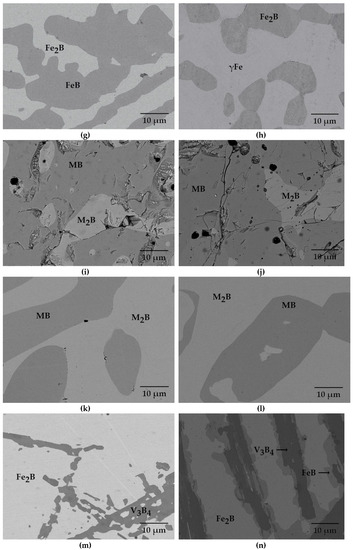 Two-phase microstructure was identifiable in eight of the investigated ternary alloys. The rest of the ternary alloys were characterized by three-phase microstructure. Three-phase microstructure is also observed in the quaternary Fe-B-Mn-V alloy. In the majority of alloys, both FeB (MB) and Fe2B (M2B) are present (Figure 1). Exceptions make the following alloys: 38.5 Fe–59.22 B–2.3 C, 34.6 Fe–52 B–13.4 C, 17 Fe–65 B–18 Cr, and 8 Fe–56 B–36 Cr, where only FeB is found (Figure 1a,b,e,f). Whilst, in alloys 82 Fe–9 B–9 Mn and 50 Fe–41 B–9 V (alloy 13), only Fe2B is observed (Figure 1h,m).