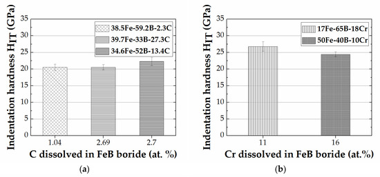 For the FeB formed in Fe-B-C alloys (Figure 5a), the difference in indentation hardness between alloy 38.5 Fe–59.2 B–2.3 C (1.04% C) and alloy 39.7 Fe–33 B–27.3 C (2.69% C) can be considered negligible. A sharp increase in the measured indentation hardness, i.e., 22.3 ± 1.3 GPa (Figure 4a), with a further increase in carbon content (2.7 at.%) in alloy 34.6 Fe–52 B–13.4 C was observed. The indentation hardness measured cannot be only associated with the C content variation in the alloy. Extrinsic influence in alloy 39.7 Fe–33 B–27.3 C (2.69% C) caused by the surrounding Fe2B can lead to underestimation of the indentation hardness. In addition, the high-volume percent of FeB in alloy 34.6 Fe–52 B–13.4 C, i.e., 54.25 vol.%, can be the reason for this difference. The indentation hardness in Cr alloyed FeB is higher at lower amounts of dissolved chromium (Figure 5b). In a like manner, the indentation hardness of FeB containing manganese is higher at lower amounts of dissolved manganese (Figure 5c,d). FeB indentation modulus shows the same behavior as the indentation hardness for the Fe-B-Cr and Fe-B-Mn alloys.
