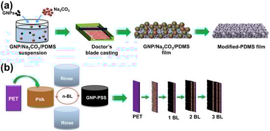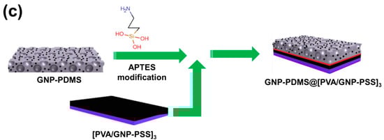 The LbL assembly of [PVA/GNP-PSS]n film was performed according to the procedure described elsewhere [30]. PVA solution (0.25 wt.%) was prepared by dissolving PVA powder in DI water. PSS-stabilized GNP aqueous suspension (henceforth, GNP-PSS suspension) containing 0.1 wt.% GNP and 0.1 wt.% PSS was prepared by co-mixing GNP nanoplatelets and PSS in DI water and then homogenized for 3 h using a tip sonicator (Sonoplus HD-1070, Bandelin, Berlin, Germany). The multilayer coating of the [PVA/GNP-PSS]n film was carried out by depositing on a 2.2 cm × 2.2 cm × 100 μm PET substrate. First, the substrate was cleaned by sonicating in IPA solution for 5 min using a bath sonicator followed by oxygen plasma treatment (PDC-32 G-2, Harrick Plasma, Ithaca, NY, USA) for 5 min to promote the conformal deposition of the first PVA layer. Then, a protective film was coated on one side of the PET surface. Finally, the substrate was alternatively dipped in a PVA solution and GNP-PSS dispersion. The dipping duration in each solution was 5 min. Additionally, every dipping process was followed by a cleaning process consisting of washing with DI water twice and air drying. One cycle was one bilayer (1 BL), and the process was halted after deposition of the desired number of BLs as shown in Figure 1b.