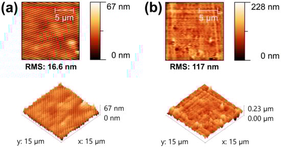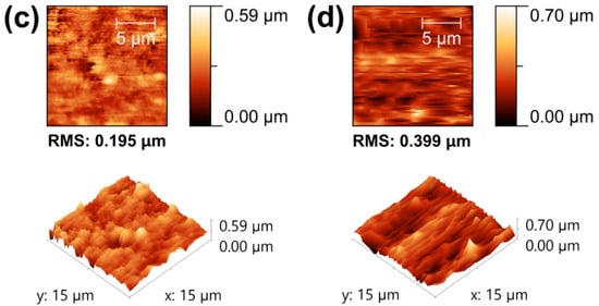 Generally, the output performance was increased by the enhanced effective contact area, compressive stress and surface charge density. Figure 2 shows the two- and three-dimensional AFM surface images of each modified PDMS sample with the RMS roughness for closer examination. The observed roughness values were 16.6 nm, 117 nm, 0.195 μm and 0.399 μm for PDMS, S-PDMS, SG-PDMS-I and SG-PDMS-II, respectively, which agreed with their top and cross-sectional SEM images (Figures S1 and S2, respectively). These surface roughness increases were caused by the pores by the Na2CO3 sacrificial template and nanoparticles by GNP loading onto the PDMS layer.