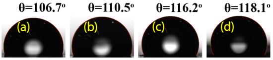 Hydrophobicity was used as evidence of functional implementation of GNP inside the PDMS layer. The hydrophobicity of each composite material was examined by measuring the contact angle (θCA) under the humid air (RH ~42%) condition. The standard deviation of the water contact angle was found to be approximately ± 0.5° and a very small droplet of water ~4.8 μL was used at 27.4 °C for each sample. As shown in Figure 3, θCA increased from PDMS to S-PDMS and SG-PDMS, sequentially, showing more hydrophobic surface due to the greater roughness and higher hydrophobic GNP loading. It has been known that the surface morphology influences the change in hydrophobicity as mentioned elsewhere [15].
