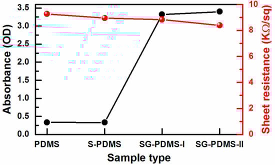 Absorbance (at 500 nm) and sheet resistance of the GNP-PDMS@[PVA/GNP-PSS]3 composite TENGs. For simplicity, only the GNP-PDMS sample labels are displayed in the x-axis.