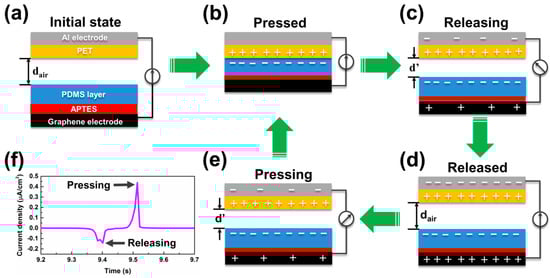 The electricity generation mechanism of the TENGs with a vertical contact separation mode is briefly depicted in Figure 5 and a finite element simulation of the potential distribution in the SG-PDMS-II/TENG was illustrated using COMSOL Multiphysics® (Ver.5.2, Altsoft, Seoul, Korea) (Figure S5). In the absence of compressive force, the TM surfaces were not in contact and thus there was no charge transfer (Figure 5a). When the two TMs were brought into contact with an external pushing force (Figure 5b), charges were generated at the interface of the two TMs. At this point, the negative triboelectric charges accumulated on the PDMS layer due to its strong electronegativity, while positive charges appeared on the PET surface. When the compressive force was released (Figure 5c), the balance of triboelectric potential was upset. As a result, an electrostatically induced charge flowed between the electrodes through an external load, which created a current flow until the device was fully restored to its original state, as shown in Figure 5d. Once an external force was applied again, a potential difference was created again due to the reduced interlayer gap distance, which resulted in an opposite current flow, as illustrated in Figure 5e. In the course of the periodical pressing and releasing processes, an alternating output signal was generated in the external open circuit, as displayed in Figure 5f.