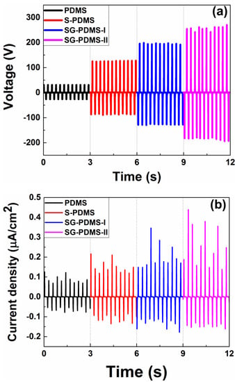 The output current performance of the TENGs at fixed loading resistance of 10 MΩ was also investigated. The maximum output current density was observed as 0.127, 0.216, 0.346 and 0.438 μA/cm2 for the pristine PDMS, S-PDMS, SG-PDMS-I and SG-PDMS-II, respectively (Figure 6b). These values indicated that the output current exhibited a similar trend to output voltage (i.e., the coupled effect of the Na2CO3 template and GNP nanoparticles yielded a high output current performance due to the increased surface area and charge density).