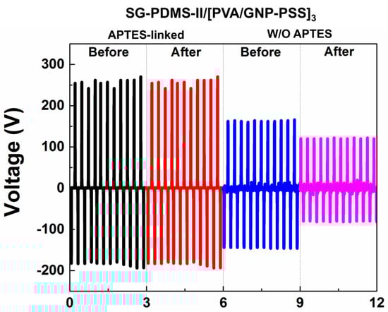 In order to confirm the prediction that TENG performance is improved due to the chemical bonding between PDMS and the electrode by adding APTES, the VOC of APTES-linked SG-PDMS-II TENG before and after 10,000 bending cycles was measured and compared to that of the control sample not linked by APTES. This was to investigate the effect of an APTES linker on mechanical stability and electrical output performance during repeated operating cycles. As shown in Figure 7, APTES-linked TENG delivered high and consistently similar output voltage after 10,000 bending cycles. On the other hand, the VOC of non APTES-linked TENG was lower, and it decreased significantly after 10,000 bending cycles, confirming the poor mechanical durability. This was attributed to the weak adhesion of PSS and PDMS surfaces, while the enhanced VOC for APTES-linked TENG was due to the reduced charge leakage between the PDMS-based TM and GNP electrode. These findings confirmed that the chemical bonding between the GNP-PDMS dielectric layer and the GNP electrode improved both the output performance and durability of the TENG.