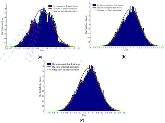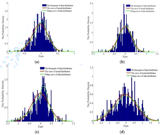 Due to the limitation of one-dimensional morphology parameters in the expression of real surface morphologies, probability density statistics and autocorrelation analyses of measured data can more accurately reflect the distribution rule and the relevant characteristics of surface morphologies; this principle will lay a foundation for the effective verification of simulated morphologies. The relevant statistics of the measured data are shown in Figure 7, Figure 8 and Figure 9.