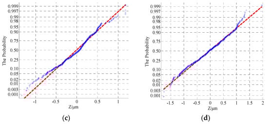 QQ test figure for different surface morphology (a) The upper surface of the specimen 1; (b) The lower surface of the specimen 2; (c) The upper surface of the specimen 3 and (d) The lower surface of the specimen 4.