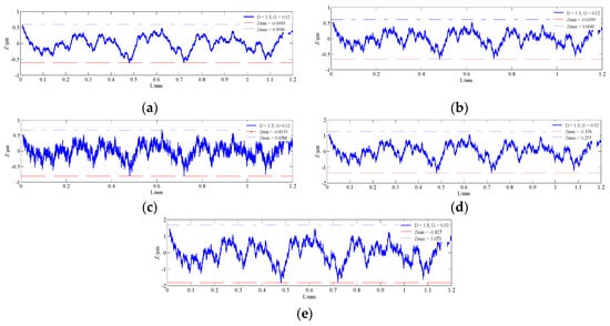 According to Equation (9), two-dimensional morphology curves of machined rough surfaces are constructed using the M-B fractal function in order to show the effect of different fractal dimensions D (D = 1.3, 1.5, 1.7) on the curve when G = 0.12; at the same time, when the D = 1.5, the scale coefficient G is 0.12, 0.52 and 0.92 respectively, and when the sampling frequency f = 10,000, that is, 10,000 points are sampled per millimeter, L = 1.2 mm, and = 3. Two-dimensional rough surface curves with different D and G are shown in Figure 10.