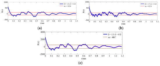 Autocorrelation graphs for different D and G: (a) D = 1.5, G = 0.12; (b) D = 1.7, G = 0.12; (c) D = 1.5, G = 0.52.